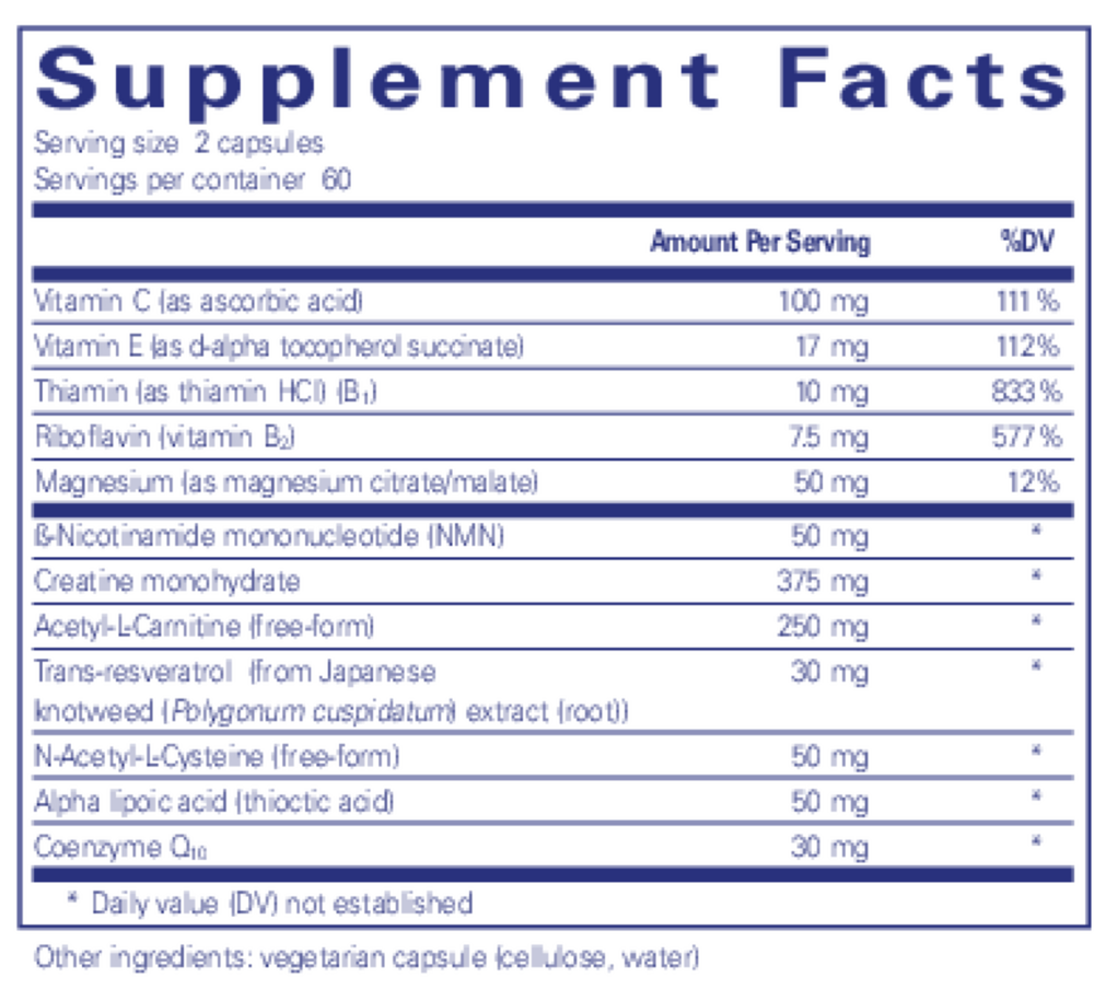 Antioxidant Complex: Includes vitamins C and E, grape seed extract, resveratrol, alpha-lipoic acid, and N-acetyl-L-cysteine to neutralize free radicals generated during mitochondrial energy production.*