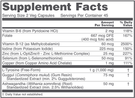 Ortho Thyroid™ is a carefully formulated nutritional supplement designed to naturally support healthy thyroid and glandular activity—key factors for optimal brain function, metabolism, and energy production.* This comprehensive formula combines L-tyrosine and iodine, the foundational building blocks of thyroid hormones, with targeted B vitamins, zinc, selenium, and trace minerals to nourish thyroid function and support metabolic balance.* Complementary botanicals guggul and ashwagandha further enhance thyroid support and promote endocrine resilience.*