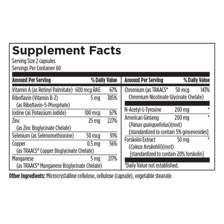 Thyroid Synergy™ is a premium, all-in-one formula designed to provide comprehensive nutritional support for healthy thyroid function.* This advanced blend features the non-stimulating adaptogenic botanical American ginseng (Panax quinquefolius) to help maintain healthy cortisol balance, blood glucose regulation, insulin activity, and balanced peripheral thyroid hormone conversion.* Essential vitamins, minerals, and complementary nutrients work synergistically to deliver effective thyroid support in a convenient two-capsule daily dose.*